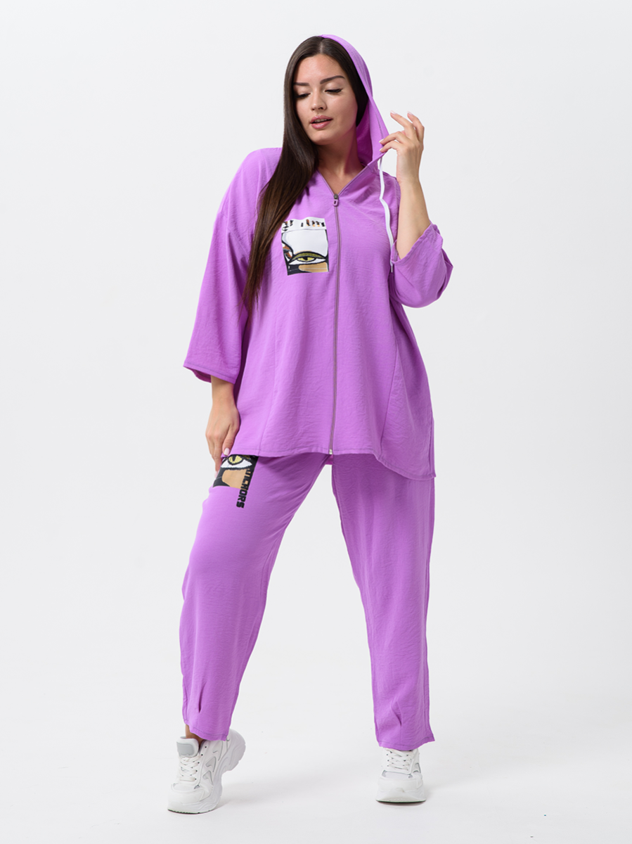 Женский стильный костюм из легкой ткани - сингапур - самое то для жаркого лета. Вверх изделия - удлинненый оверсайз кофточка на молнии с капюшоном, рукава спущенные - длина до запястья (длина рукава указана от горловины). Низ - свободные брюки с карманами, пояс на резинке, снизу имеется защипка, которая слегка заужает штаны. Костюм декорирован принтом. Свободный и стильный, не сковывает движения. Двойка на каждый день в приятных расцветках - хорошая находка для вашего гардероба!